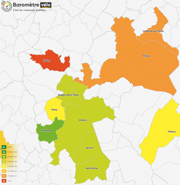 Si Fillière reste en climat « Défavorable », on peut noter une belle progression pour Epagny-Metz-Tessy, qui rejoint Sevrier et Saint-Jorioz en « Plutôt favorable ». Et si Poisy (« Moyennement défavorable », en progrès) ne peut se targuer du même score que Chavanod (« Favorable », très forte progression), on constate pour toutes ces communes que là où des infrastructures sécurisantes ont été réalisées ces dernières années, les cyclistes s’en félicitent et le soulignent sur la cartographie des progrès.